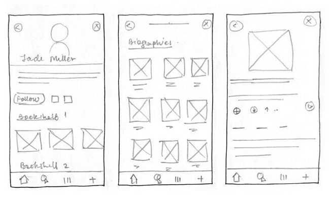 I brainstormed different ideas and decided to expand on the concept of bringing trusted social media reviewers onboard as audiobook ‘curators’. To properly visualize this solution I created a storyboard and began sketching low-fidelity screens. I then designed key flows around finding curator profiles and audiobook matches.