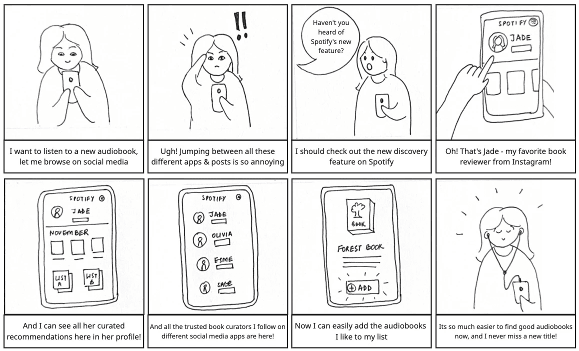 Audiobook discovery on Spotify lacks the depth and intentionality that users experience with music. While listeners rely heavily on trusted creators and social recommendations to choose what to read next, those signals live outside the platform — scattered across YouTube, TikTok, and Reddit. This creates friction, research fatigue, and missed opportunities for meaningful engagement within Spotify’s audiobook ecosystem.