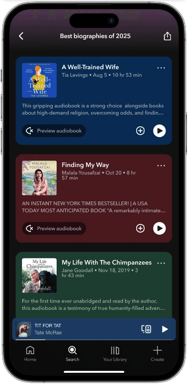 Your followed curators live right inside the Audiobooks section, ready when you are.