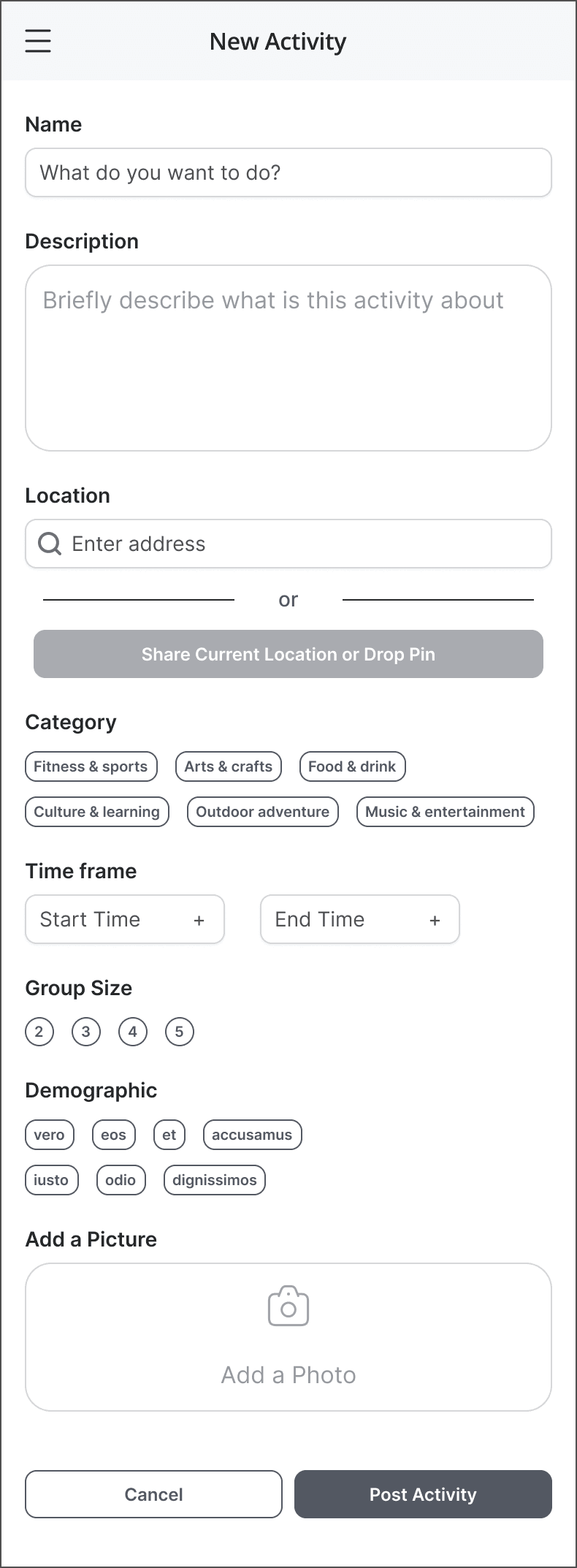 Unveil set out to change that. Instead of matching people first, we centered the experience around shared activities—making connection feel natural, low-pressure, and grounded in real-world context. Research validated that what people truly want isn’t more chatting, but clearer intent, small-group settings, visible safety signals, and minimal coordination before meeting.