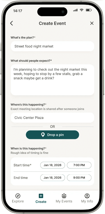 Together, we explored how people-first social apps rely heavily on swiping and messaging, while event platforms demand too much commitment and feel impersonal. Both approaches often fail to translate into real-world meetups.