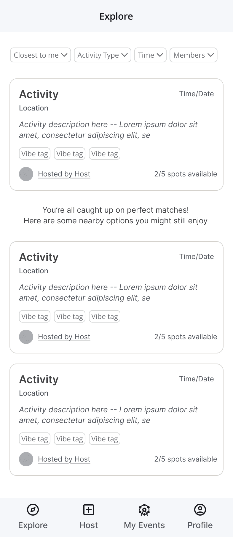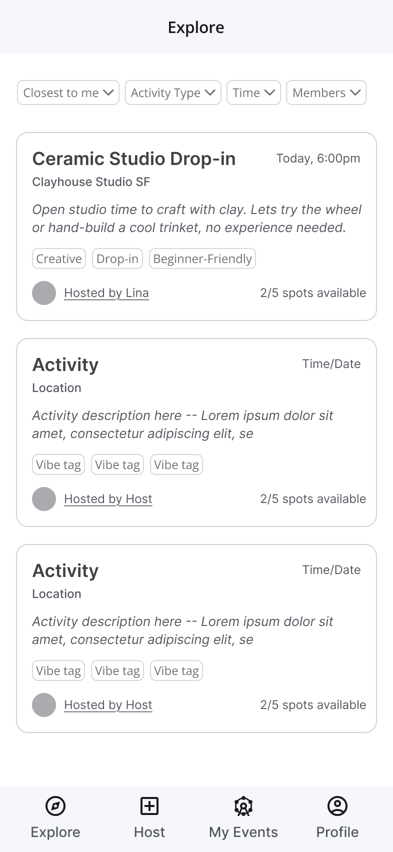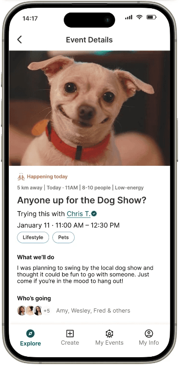 If that's not your style, browse real, nearby activities people are already planning - no swiping, no endless chatting. See who's posting, what the vibe is, and all details upfront so you can confidently join.