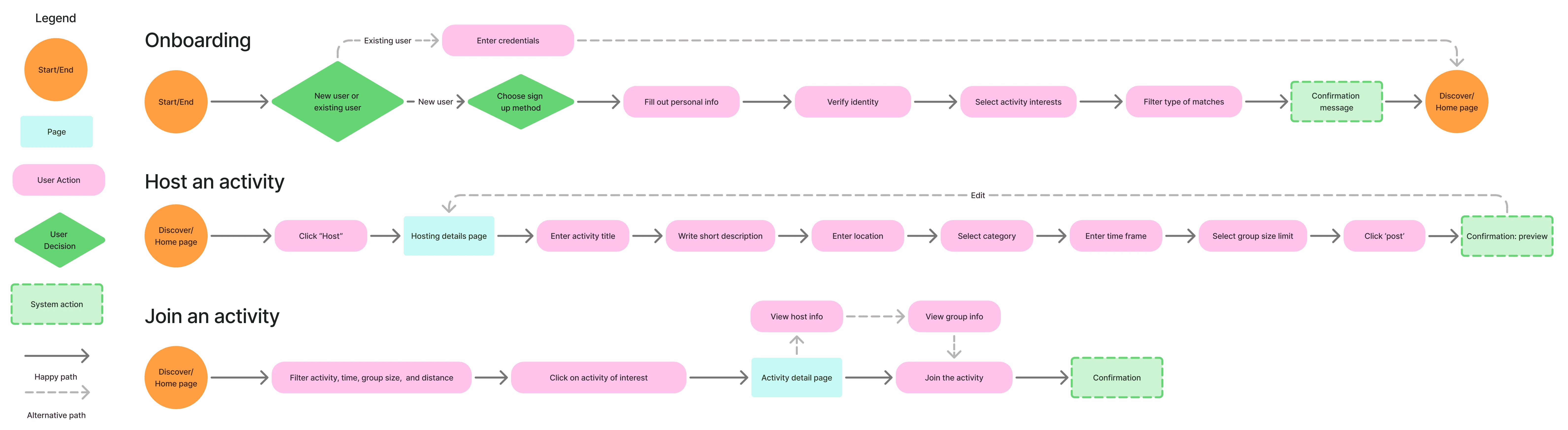 We translated research insights into clear design principles focused on easy discovery, quick opt-in, and reduced planning overhead. I helped map core user flows including onboarding with user preferences for enhanced suggestions, activity discovery, and creating and joining an activity.