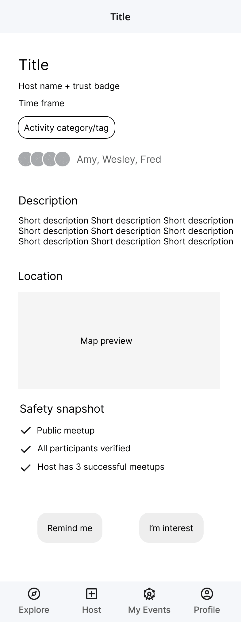 As we worked on wireframes, we paid particular attention to information hierarchy and language - using tone, labels, and structure to signal approachability, flexibility, and safety. The goal was to make participation feel inviting, optional, and easy to disengage from if needed.